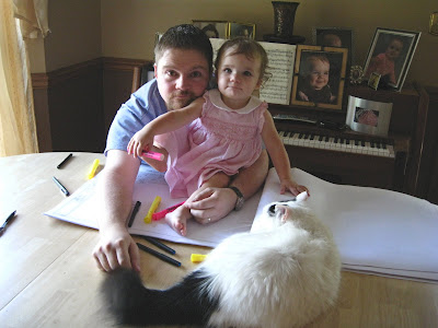 Oreo is ALWAYS jumping onto his drawings. This time, he had two people that kept wanting on them. Ali kept saying “up!”, and she did NOT want to get off of Daddy’s drawings. But luckily he was able to finish up after her bedtime :)