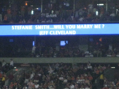 At halftime, there was an marriage request:I love how he felt like he needed to sign his first and last name. Just in case Stefanie thought it was another Jeff asking her to marry him.
