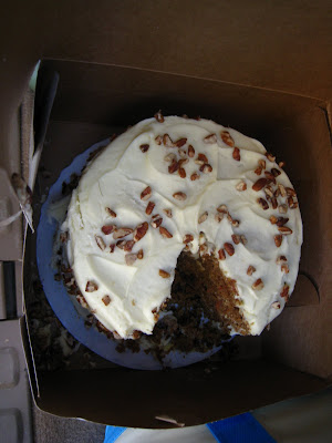 Remember my birthday a couple of weeks ago? You know, that day that I spent deathly ill. . . yeah that one. Anyway, as part of my birthday surprise, Chris had ordered me my favorite kind of cake, a carrot cake – a large – actually huge one –from a wonderful Birmingham bakery, Edgar’s.