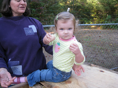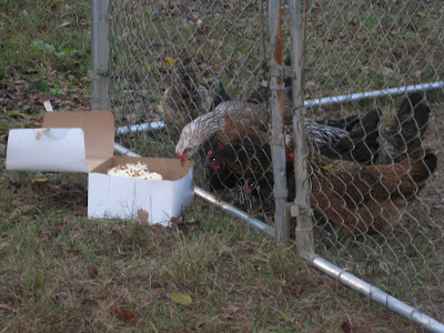 Then we had to bright idea to take it to the chickens when we picked Ali up. At least it would make for some super-sweet eggs. And since Ali took stale Panera Bagels to them the day before (she is really obsessed with the chickens right now), we figured their tastes might have gotten distinguished and would prefer a bakery cake to their chicken feed.