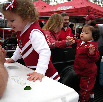 And then today, we went to Tuscaloosa for the epitome of the football season: The Iron Bowl. We took Brad, Deidre, and Kendall. The girls had a blast tailgating together! Although both of them seemed to think that tailgating meant dirtying their own tailgates, of which they both did an admirable job (wow this post has a lot of poop references).
