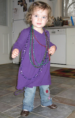 My Aunt still had Mardi Gras beads from 1985 (I think my parents kept my cousins for them to go that year, and I actually remember them bringing home piles of beads in paper FoodMax grocery bags. So I played with those same beads as a four year old!). Anyway, Ali L-O-V-E-D them. She spent at least 30 minutes just putting them on and taking them off.