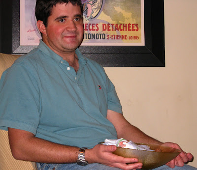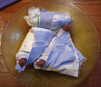 Gift #1: I started with a beautiful, sparkly, gold glass bowl:Then Chris and I borrowed some (unused) diapers from Ali. We put some water in them to give them some heft, and then used some year-old Choxie Chocolate Flaky Truffles for garnishing to create Bowl a la Poo: