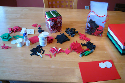 Then on Thursday, AJ and Ashley came over and we made Christmas cards with one of the girl’s favorite toys: Shapes. I got a set of Snowman shapes, glittery letters, and backing. The table started out looking like this: