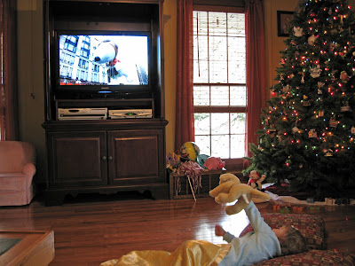 Laying on the floor in front of the Christmas tree, all snuggled in a blankie, watching the Macy’s Thanksgiving Day Parade.. . . and making sure to hold up Layla the Puppy so that she could see Snoopy the Puppy on TV.