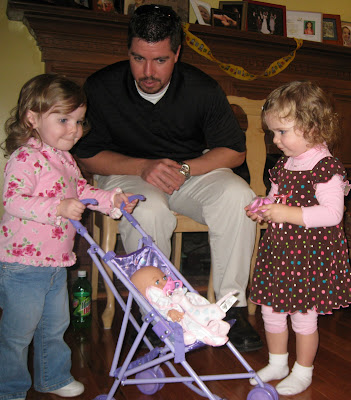 Friday night, we had her birthday party. She got to wear her “party dress”, and couldn’t have been more thrilled, because, as she squealed to Daddy when he walked in with the Pizza, “EVERYBODY’S here!!!!”She and AJ got to play with her Thomas table,