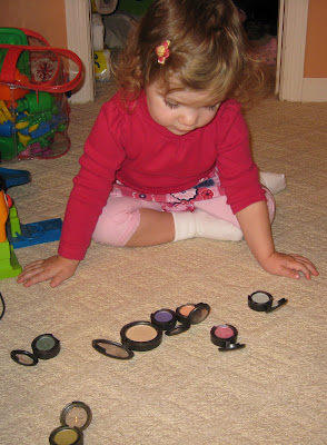 Notice all of the toys in the background. Instead, this is what Ali does while I get ready (when she’s not drawing herself up with lipstick, that is):She opens them all, looks at them lovingly (doesn’t touch them because Mommy has taught her not to AND she hates getting things on her hands),