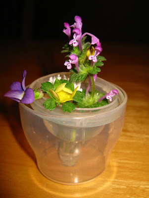Flowers picked by Daddy and Ali and “creatively vased” by Daddy for Mommy:I have no current use for those bottles anyway. . .