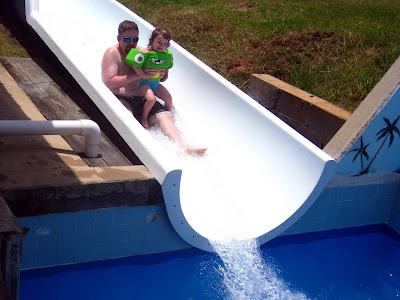 After that, we convinced Ali that the original slide was “FUN!!” and “made” her go down it one more time before we let her go back to the pool, this time with Daddy. I think she would have enjoyed it had she not been dreading a dunking all the way down: